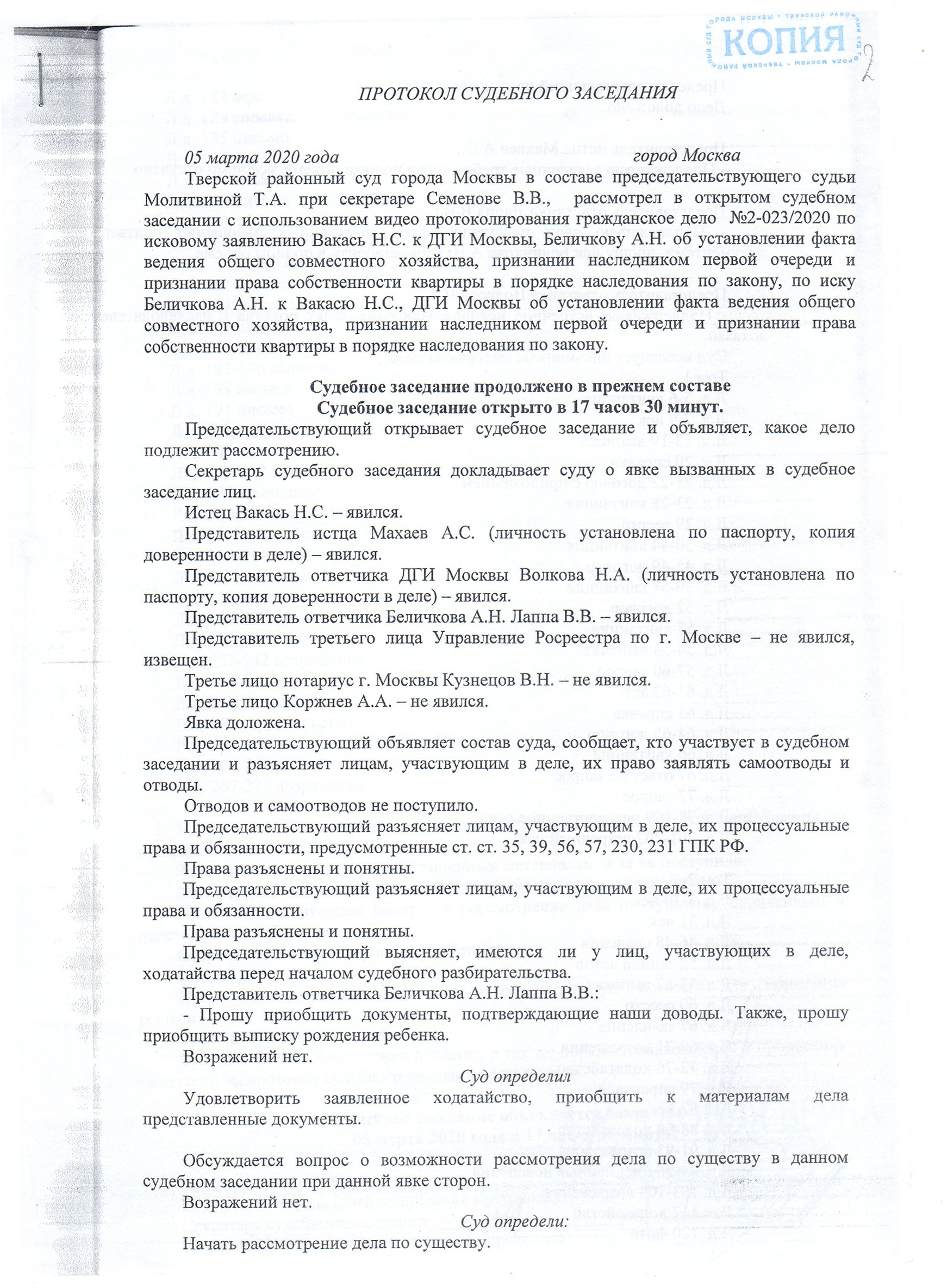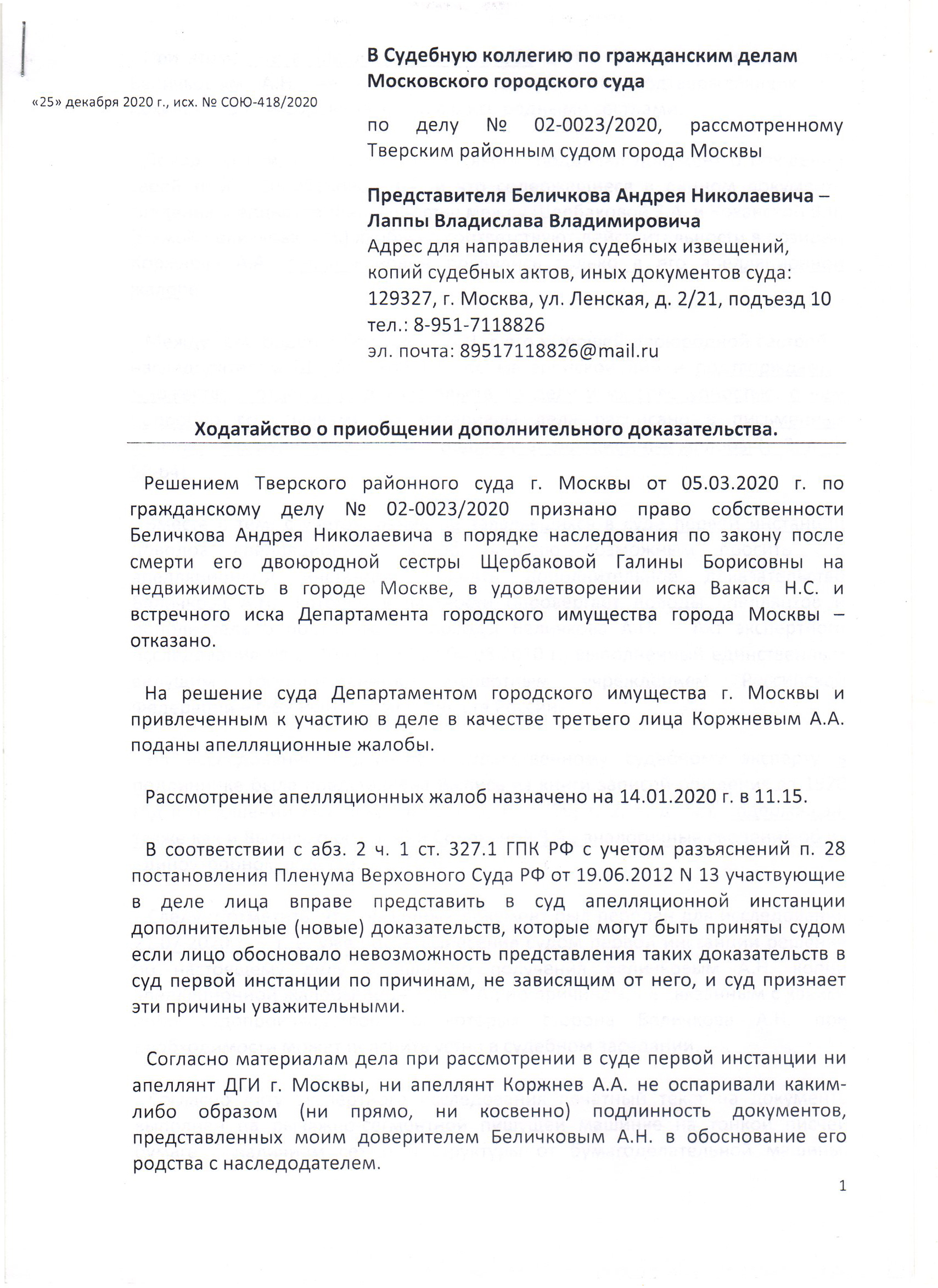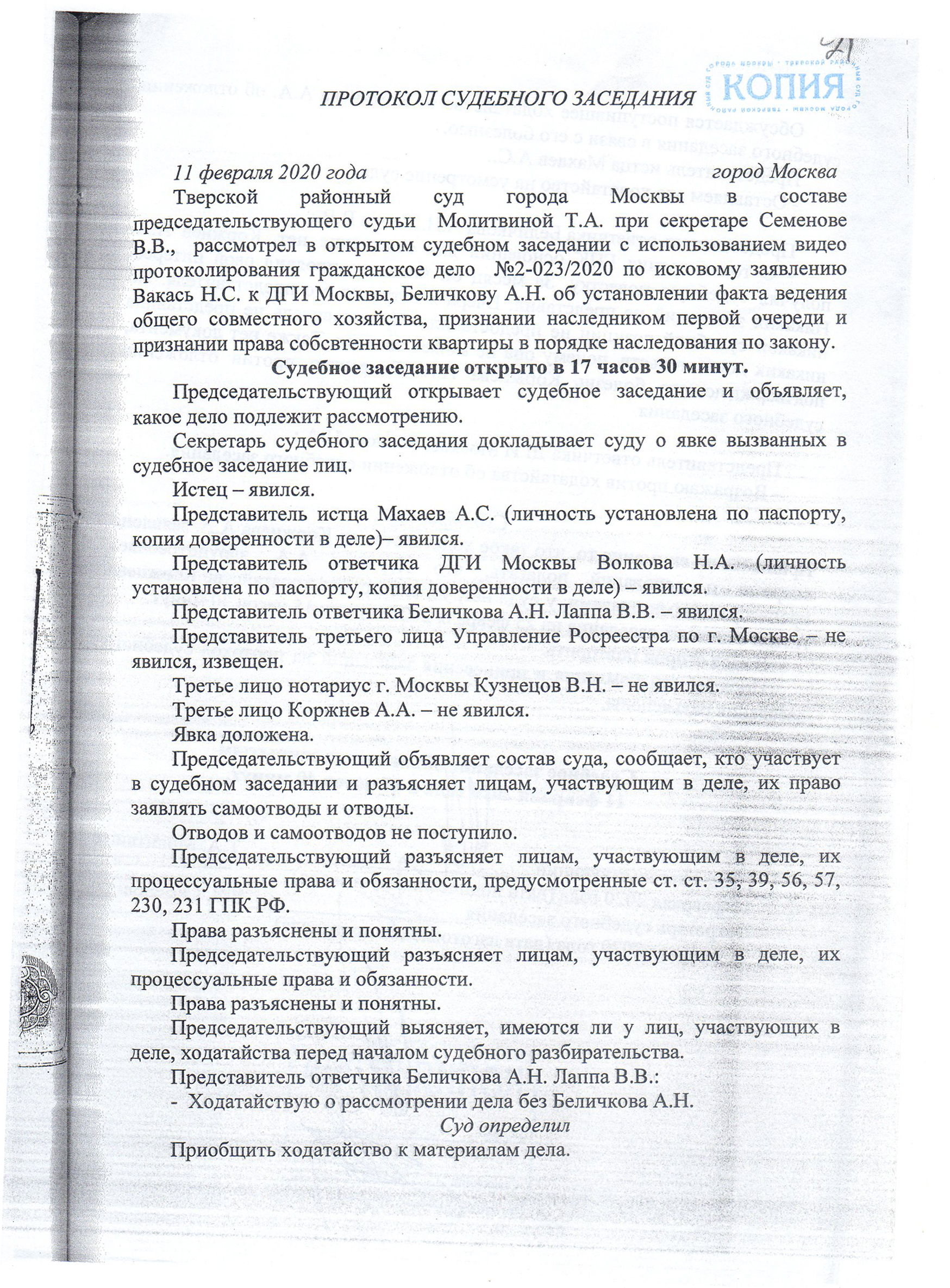 Ходатайство о приобщении дополнительного доказательства (мошенников юриста Лаппа В.В. и Беличкова А.Н.) в гражданское (наследственное) дело № 02-23/2020, PDF - форматПротокол судебного заседания Тверского районного суда города Москвы от 14/01/2021 года, страница 1/7