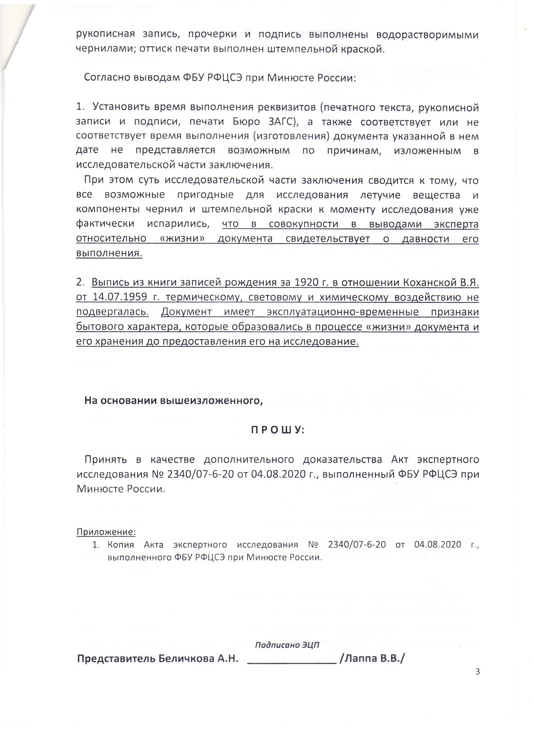 Ходатайство о приобщении дополнительного доказательства (мошенников юриста Лаппа В.В. и Беличкова А.Н.) в гражданское (наследственное) дело № 02-23/2020, страница 3/3Ходатайство о приобщении дополнительного доказательства (мошенников юриста Лаппа В.В. и Беличкова А.Н.) в гражданское (наследственное) дело № 02-23/2020, PDF - формат