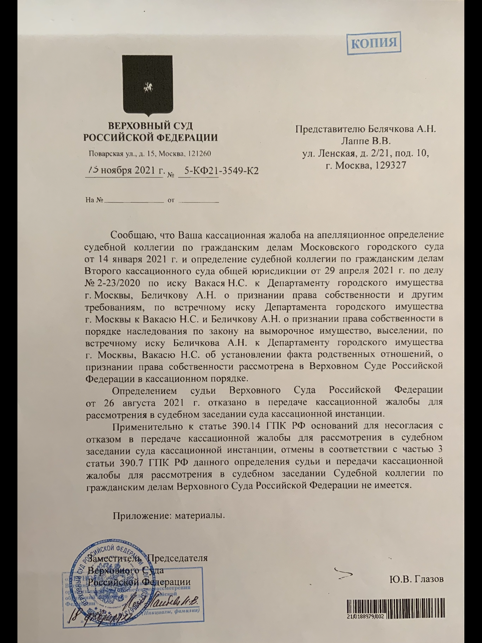 3) Определение Второго кассационного суда общей юрисдикции от 29/04/2021 года на апелляционное определение судебной коллегии по гражданским делам Московского городского суда по гражданскому делу № 2-23/2020 по иску Вакась Н.С. к Беличкову А.Н., Департаменту городского имущества города Москвы об установлении факта принятия наследства, о признании права собственности
