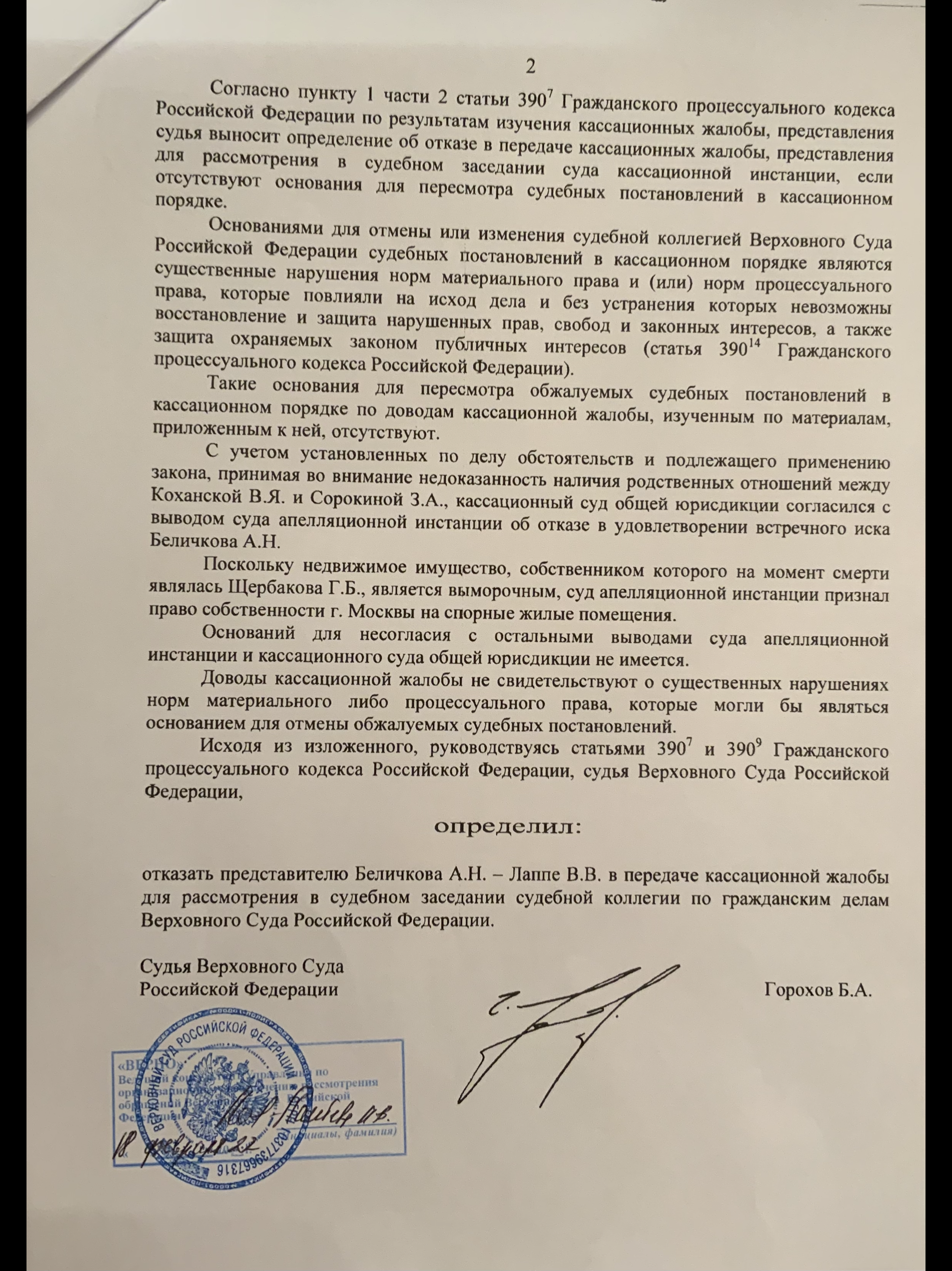 Ответ Верховного Суда Российской Федерации № 5-КФ21-3549-К2 от 15 ноября 2021 годаСвидетельство о рождении матери лжебрата Щербаковой Галины Борисовны Беличкова Андрея Николаевича, который в суде заявлял на основании поддельного документа, что его мать Коханская (Веннер) Валентина Яковлевна является внебрачной дочерью Сорокиной Н.Е.