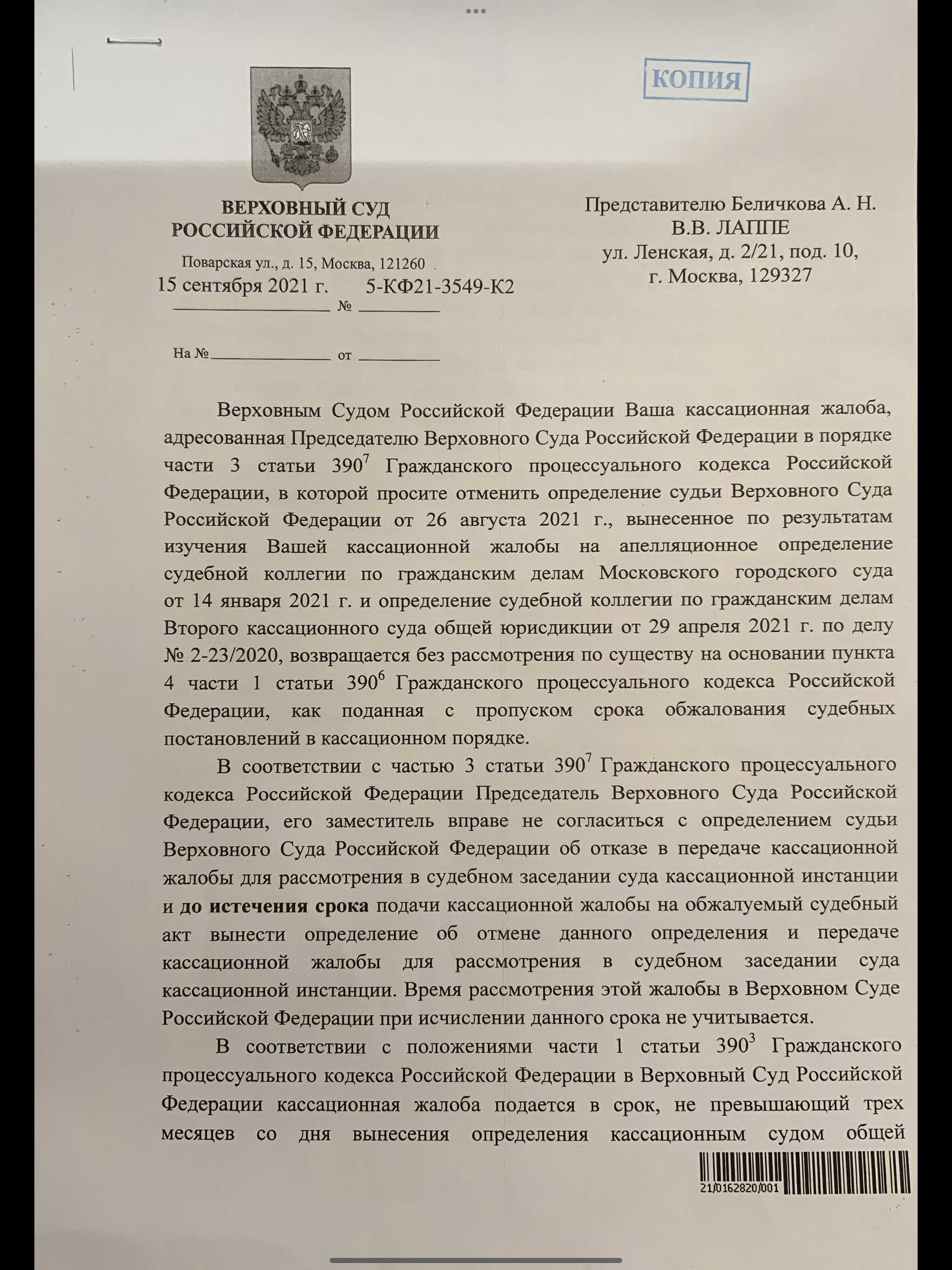 Определение Верховного Суда Российской Федерации № 5-КФ21-3549-К2 от 26 августа 2021 года, PDF - форматОтвет Верховного Суда Российской Федерации № 5-КФ21-3549-К2 от 15 сентября 2021 года, страница 1/3