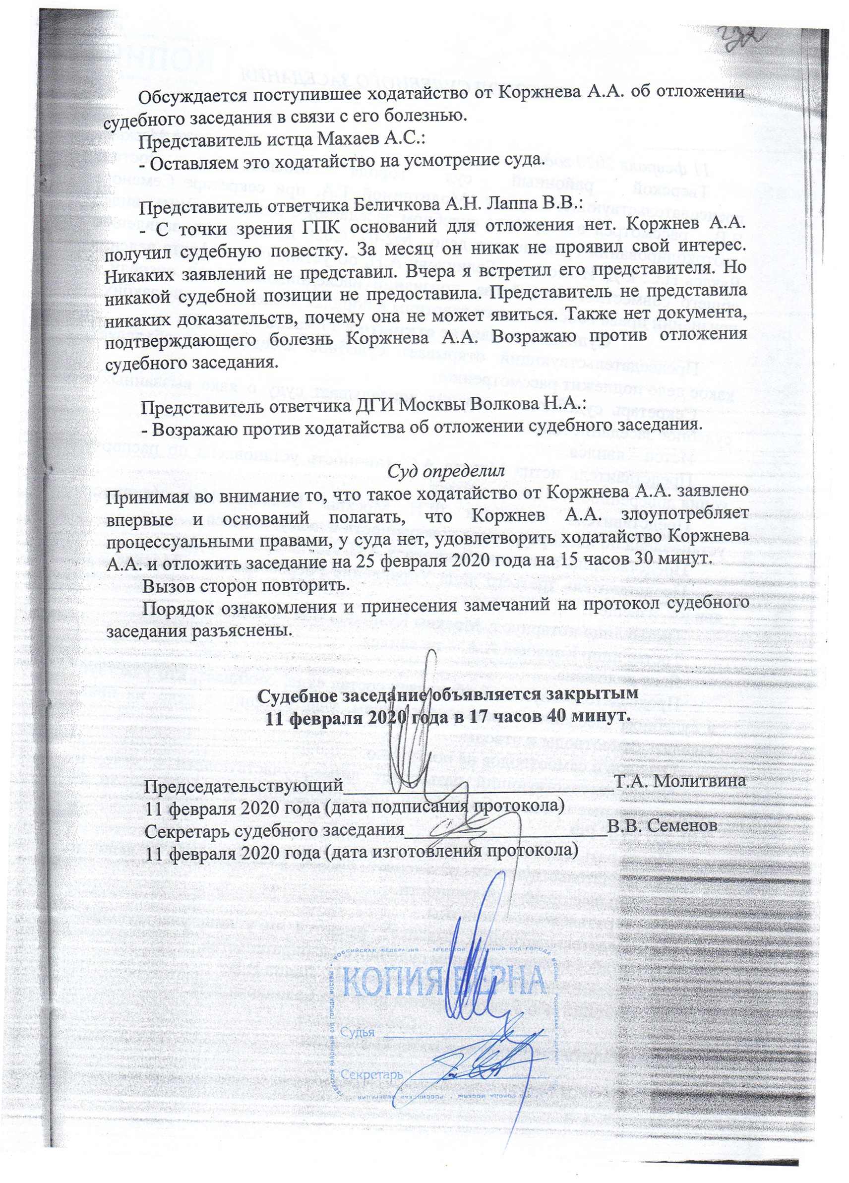 Протокол судебного заседания Тверского районного суда города Москвы от 11/02/2020 года, страница 1/2