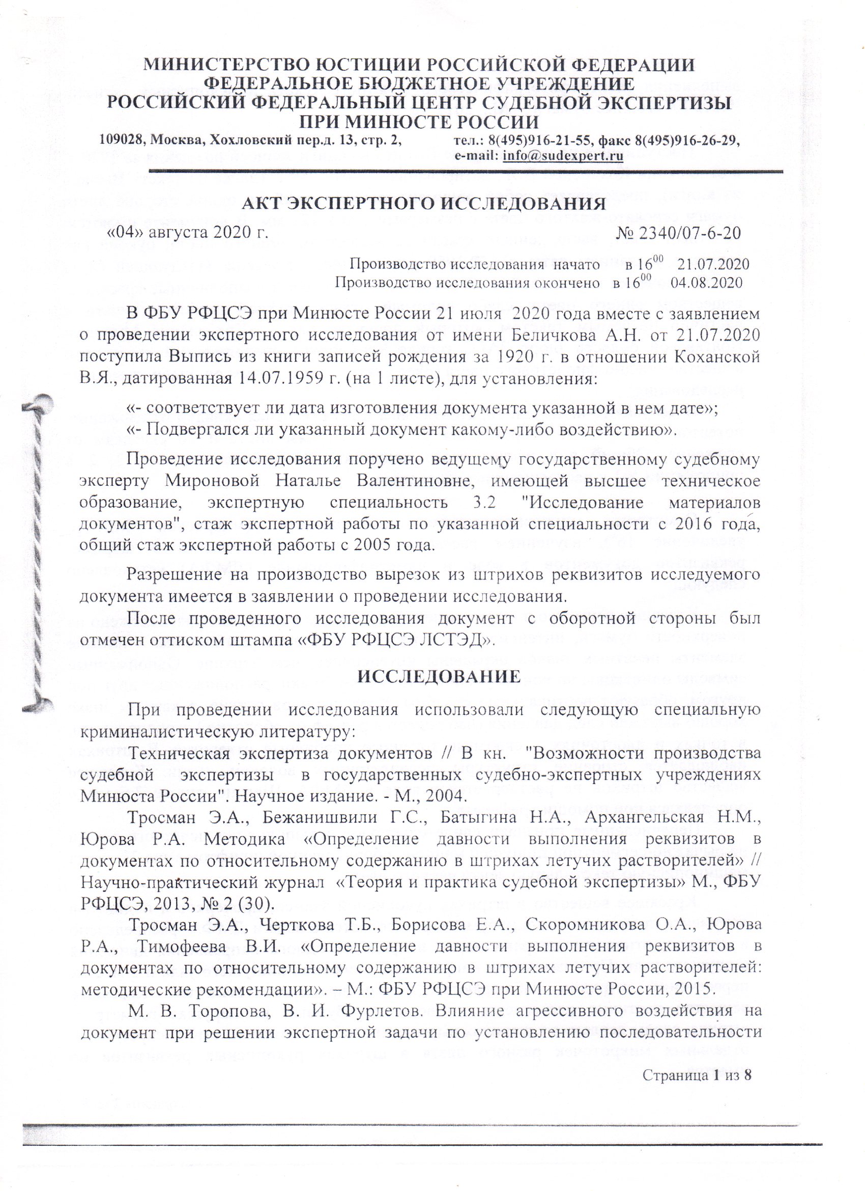 Решение Тверского районного суда г. Москвы от 05/03/2020 года по гражданскому (наследственному) делу № 02-23/2020, PDF - форматАкт экспертного исследования № 2340/07-6-20 от 04 августа 2020 года мошенников юриста Лаппа В.В. и Беличкова А.Н. для гражданского (наследственного) дела № 02-23/2020, страница 1/8